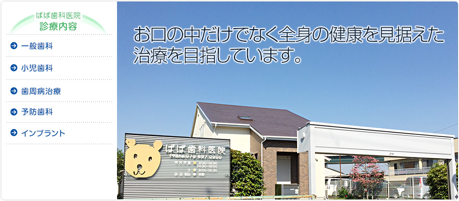 | 概要 | 門真市横地で虫歯・歯周病の治療や、口腔外科・予防歯科・インプラント・顎顔面口腔育成治療ならばば歯科医院。京阪門真団地バス停から徒歩5分、顎顔面口腔育成治療に力を入れています。島頭、脇田町、下馬伏町、北島、岸和田などからもお待ちしています。 |